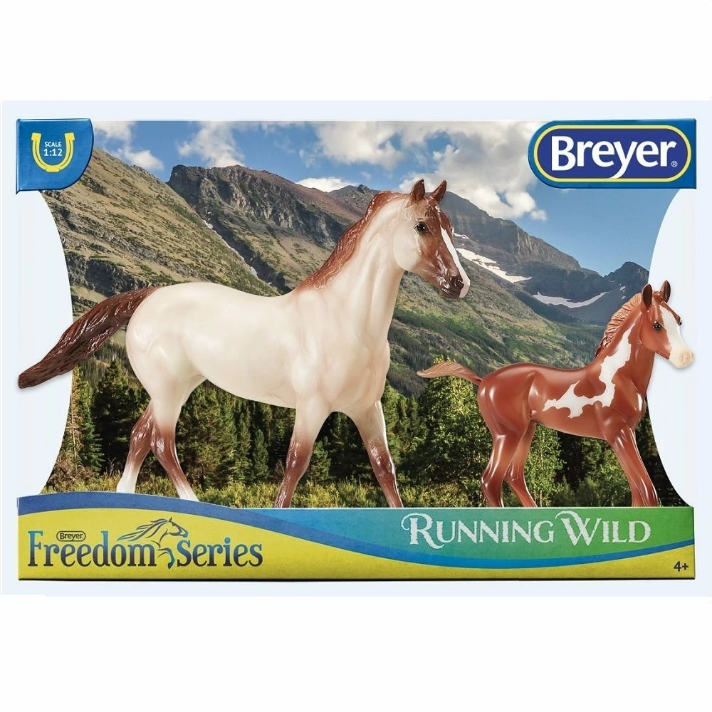 Mustangs are feral horses that are found in the American west. They descended from horses brought to the Americas in the 16th century by Spanish explorers. Today they’re protected by the Wild Free-Roaming Horses and Burro Act, which calls mustangs “living symbols of the historic and pioneer spirit of the West.” This set includes a red roan stallion, and his chestnut pinto foal.
