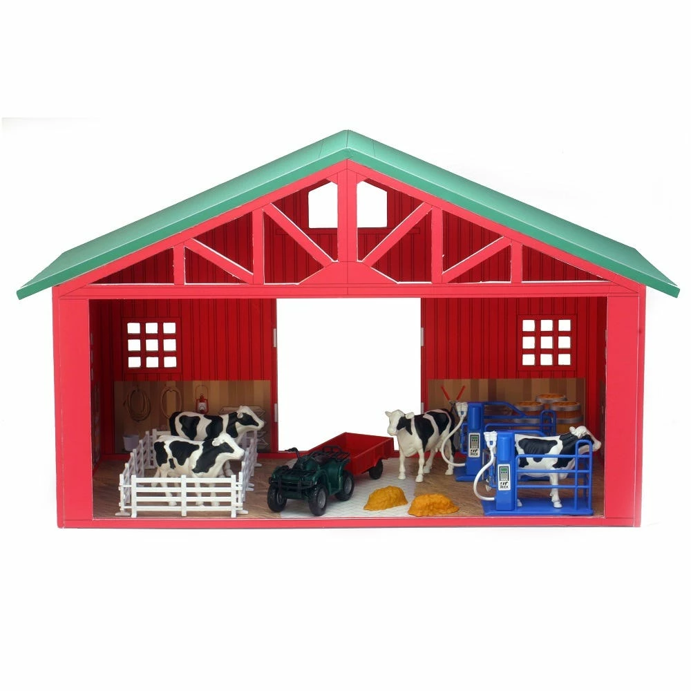 The Country Life Extra Large Barn Dairy Set Comes With 1:18 Scale Cows And Utility Vehicle With Trailer. Also Included With The Set Are Milking Stations And Fences. All Of The Accessory Items Fit In The Back Of The Barn.