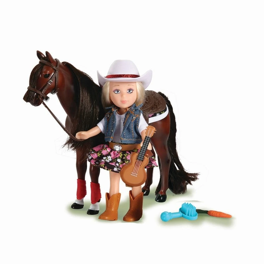- Accessories include: brush, apple, cowgirl hat, and guitar