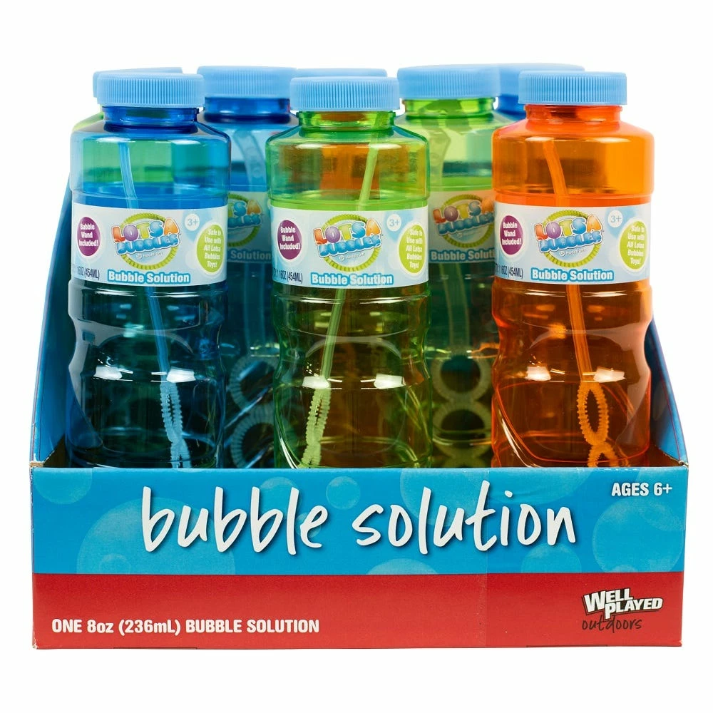 Blow bubbles that fly further and last longer with these bubble wands! This bottle of non-toxic, bubble solution includes a bubble wand and comes in a variety of bright and fun colors, Which color bottle you get is a surprise!
