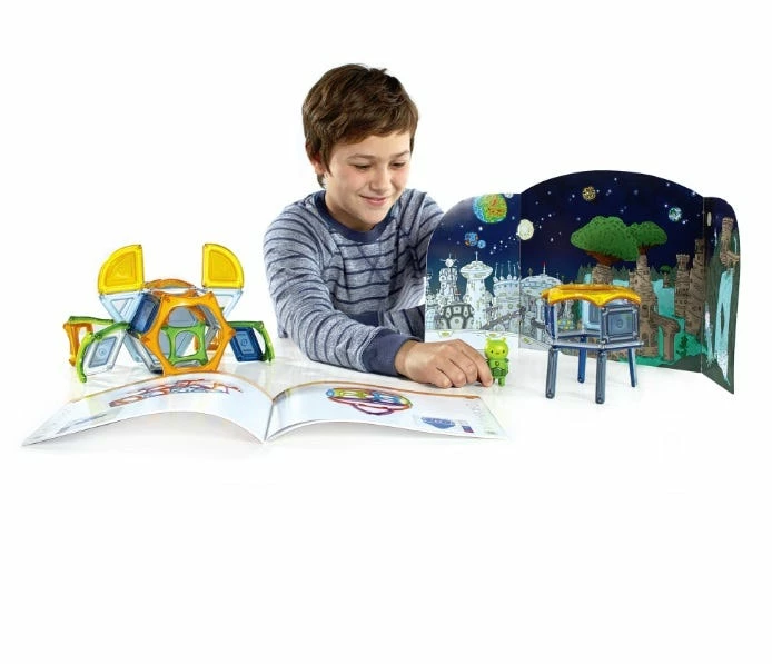 This exciting premier set of the NEW PowerClix® Explorer Series, combines 54 pieces of all three PowerClix® design languages, Frames, Solids and Organics, for the first time. The new series is designed to encourage multiple STEM skill development while sparking a child’s imagination and creativity. The build guide includes an original illustrated comic, interactive backdrop and space figure for dramatic play. All artwork and storyline created by talented 16 year-old artist, Ethan Wadsworth. Children will explore the universe with Space Guy and his friend, commandeering spaceships and fighting evil aliens they have created themselves. Suggested Age: 5