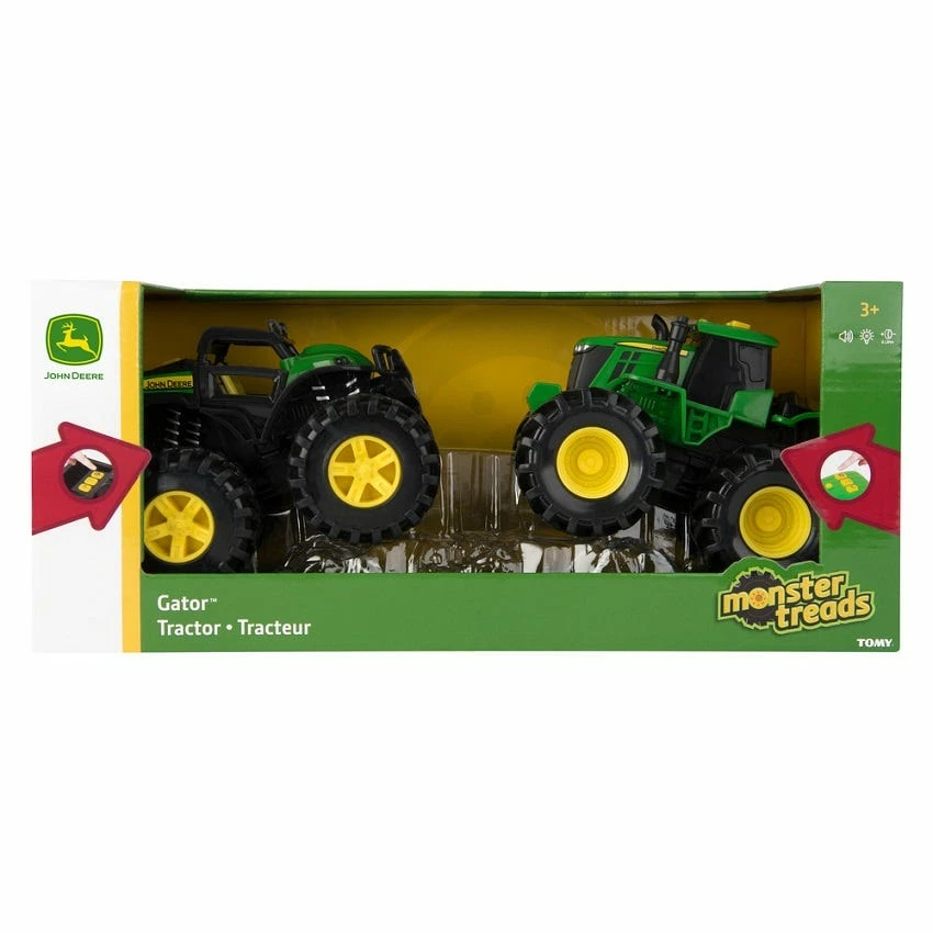 The best of both worlds collide when the power of John Deere meets monster vehicle styling! This gift set includes (2) lights and sounds John Deere vehicles; a Gator and tractor! Each features lights, sounds, and super bouncy tires. The perfect gift for that young John Deere fan in your life! Batteries includes. Conquer the off-road terrain with John Deere and Monster Treads!