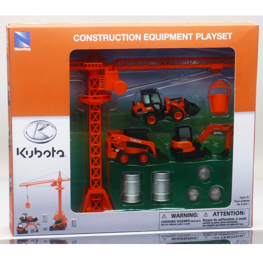 This Playset Includes Everything Needed At A Construction Site. A Tower Crane (The Arm Rotates 360O ), A Kubota Front Loader, A Kubota Excavator And A Kubota Skid Steer. All Of The Vehicles Are Die Cast And Operate By Pulling Back.