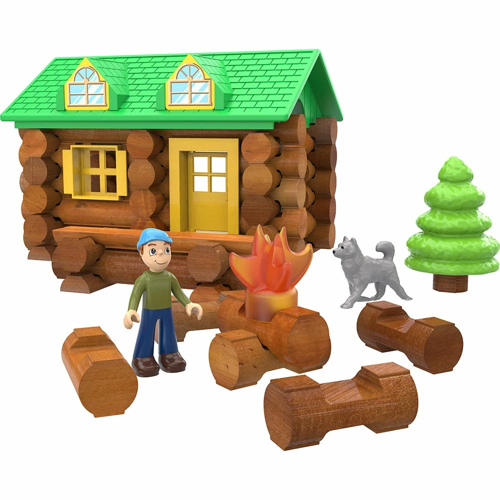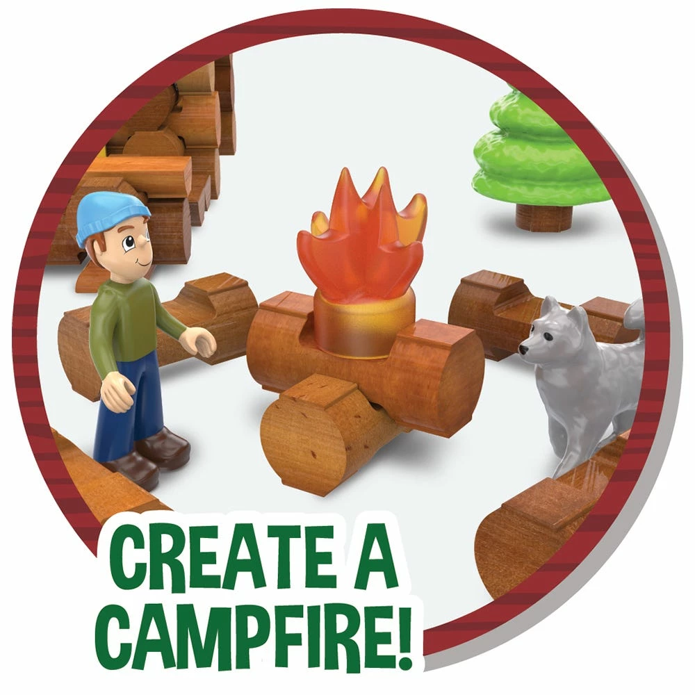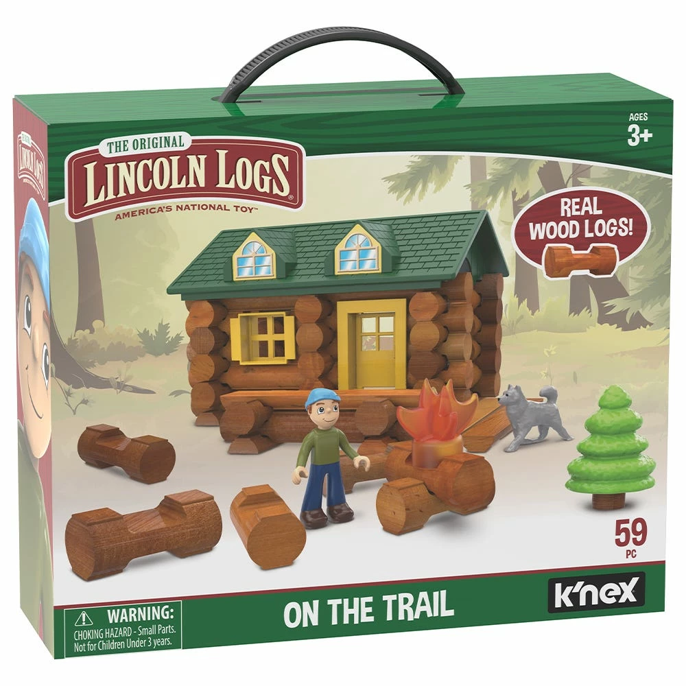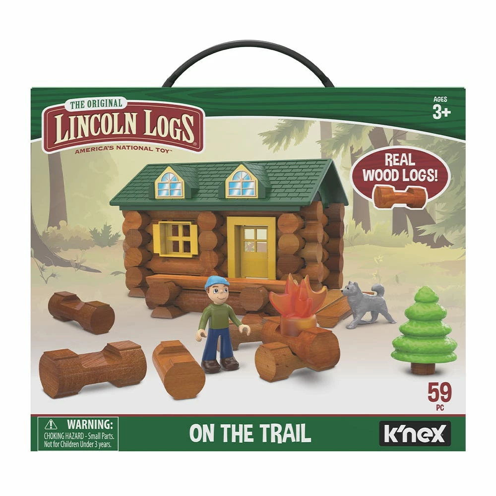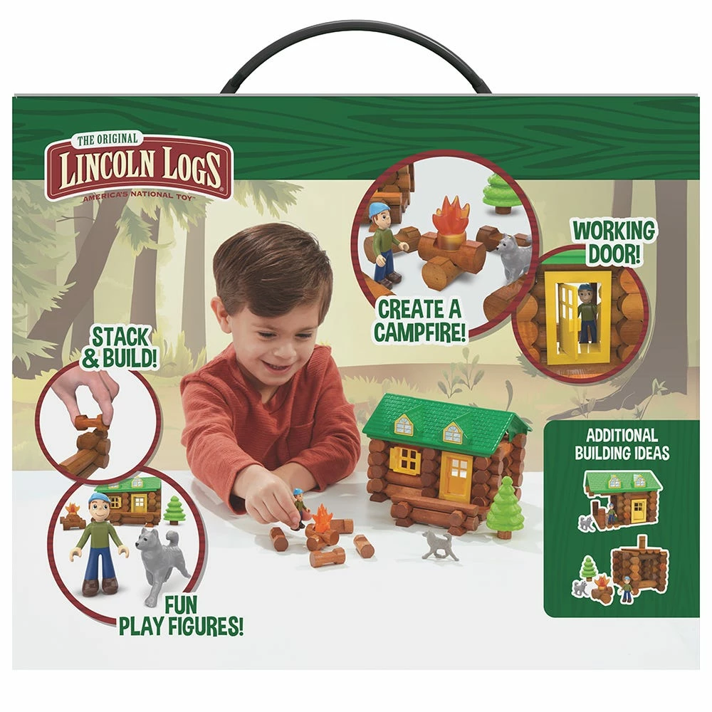 Create a cozy log cabin scene with the LINCOLN LOGS On The Trail build & play set! This preschool building toy includes real wood LINCOLN LOGS pieces, a classic beloved by generations of children. The On The Trail set comes with 59 pieces: colorful roof, windows, and a working door, plus fun play figures and accessories like a hiker figure, a wolf, a tree, and a bonfire!