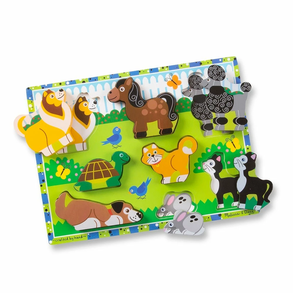 Seven favorite farm animals and a farmer stand out against the big red barn. Extra thick wooden puzzle includes eight pieces, with jumbo wooden knobs that are easy for children to grasp. Full-color matching pictures appear underneath each piece. Encourages hand-eye, fine motor and visual perception skills.