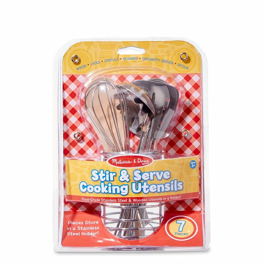 This 7-piece set brings a professional touch to play kitchens! Six sturdy utensils, made of stainless steel and wood, are generously sized to offer a pleasingly realistic effect for little chefs. All of the tools (whisk, ladle, slotted spoon, spaghetti server and wooden spoon) fit in a metal holder to bring a shining touch to pretend play! Durable and built to last, the set is sized to coordinate with Melissa & Doug’s Let’s Play House! line of pretend-play accessories.