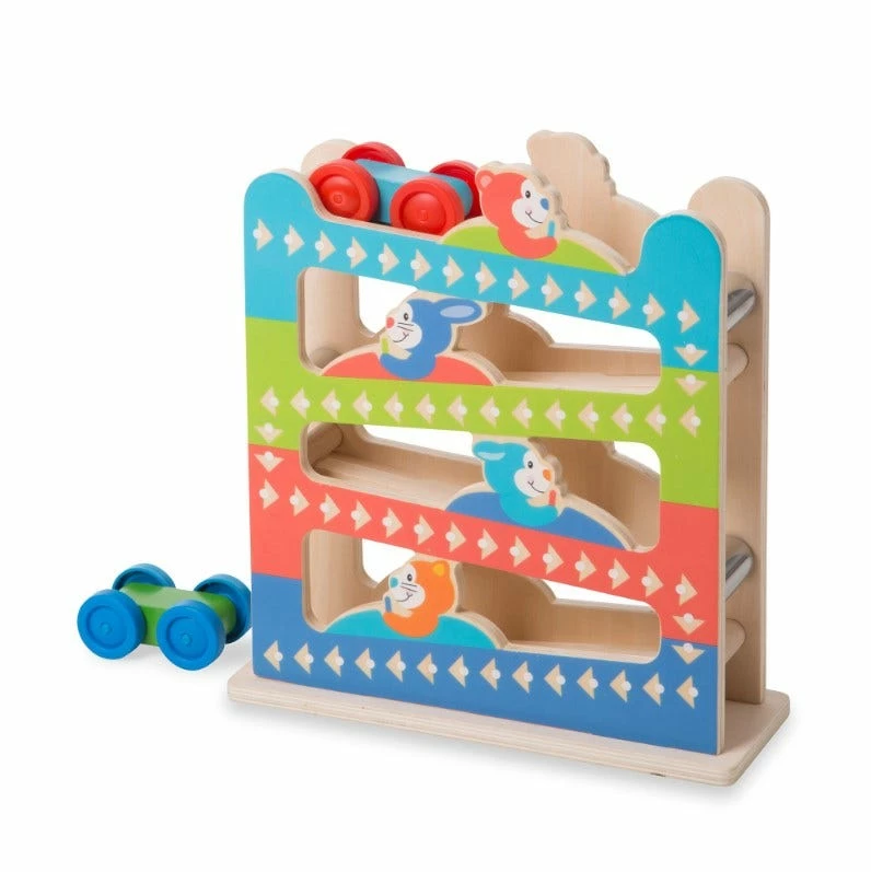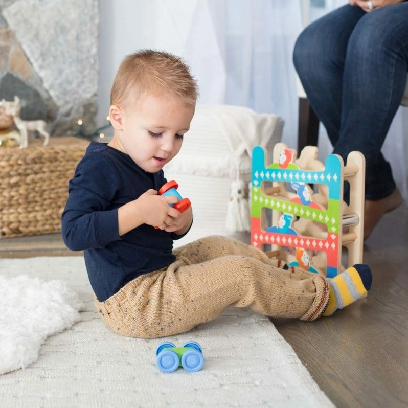 Keep playtime rolling with two wooden cars that zoom, zip, ring, and flip down the wooden zig-zag track! Kids 12 months and older will delight in dropping a car at the top of the tower and watching as it makes a chime ring at each turn, and as the car flips over to zoom down the next ramp. This engaging, hands-on activity encourages sensory development and fine and gross motor skills. First Play toys feature bright colors, bold patterns, and whimsical designs that boost skills while sparking imagination and wonder right from the start!