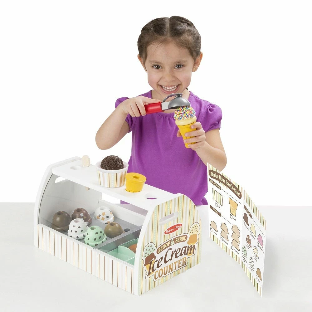 Scoop up some cool treats with this all-inclusive, 20-piece pretend play ice cream counter! The sturdy wooden tabletop counter holds eight wooden scoops of different-flavored ice cream, six assorted toppings, two cones, a plastic cup, an ice cream scooper and a wooden spoon. The scooper fits into a hole on top of the scoops to lift, stack, and release. Take orders on the reusable menu card and serve up delicious fun!