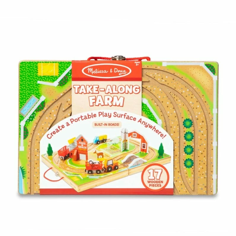 Built-in tracks, colorful scenery, and fun play pieces let kids take their imaginations for a spin . . . and take playtime anywhere they want to go! Unfold the sturdy wooden case to create an illustrated play surface with built-in road tracks for the four farm vehicles (a truck, tractor, and two trailers with magnetic couplers). Set up a bridge, a barn with silo, and a grain house! Wooden play pieces include trees, animals, and hay bales to enhance imaginative storytelling. All the pieces store in the fold-up case with convenient carrying handle for easy cleanup and travel (there’s plenty of room to add other toys, too!). Keep playtime rolling for kids three and older and encourage independent play and motor skill development.