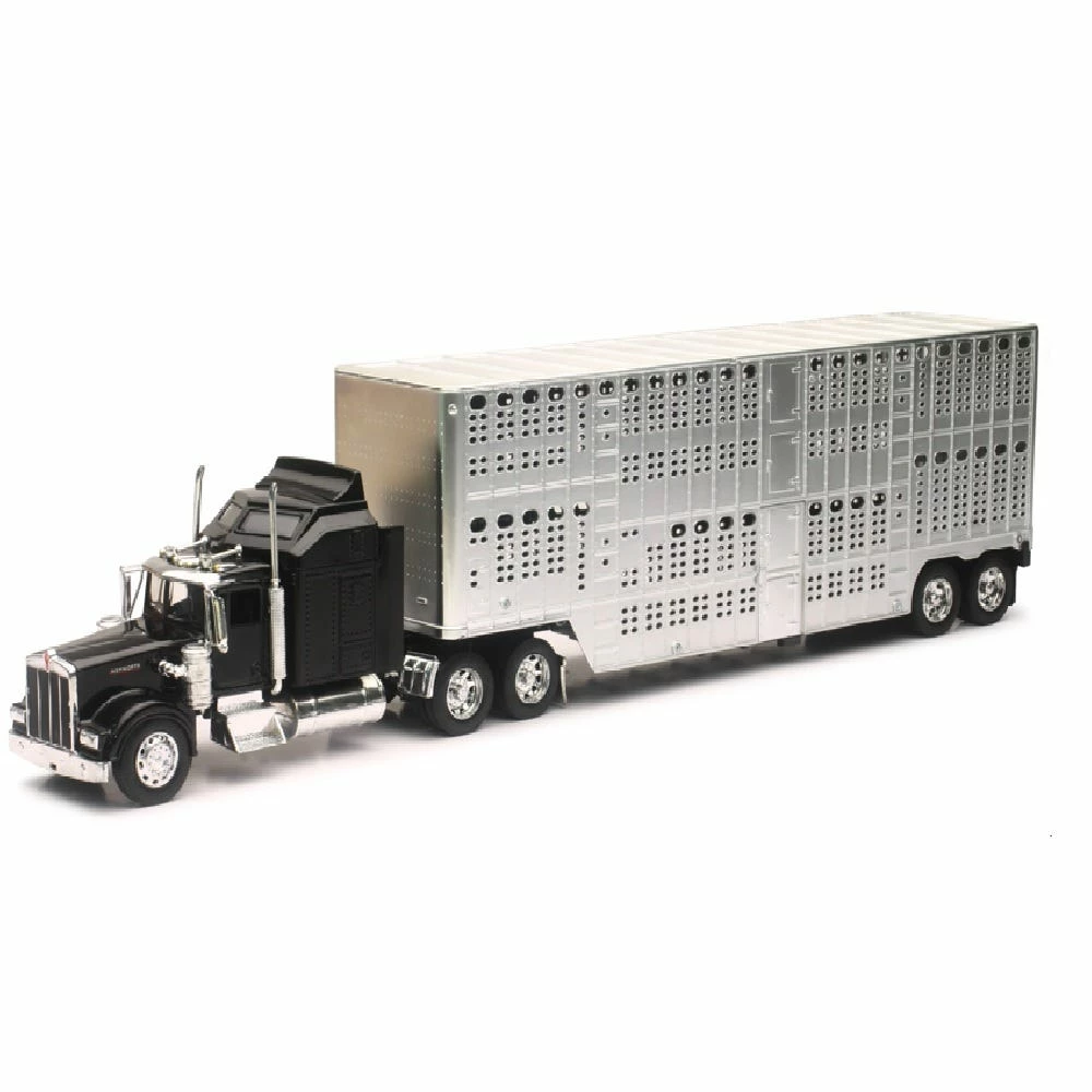 1:32 die cast Kenworth semi cab with free-wheeling action; plastic chrome-look cattle hauler trailer