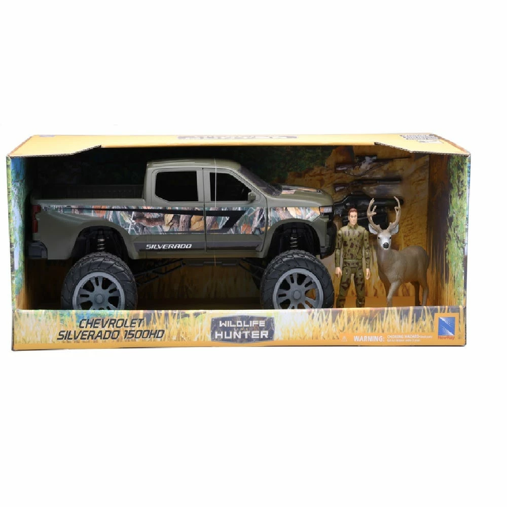 1:14 scale Chevrolet 1500 monster pick-up with camo decals, fully-articulated figre and deer.