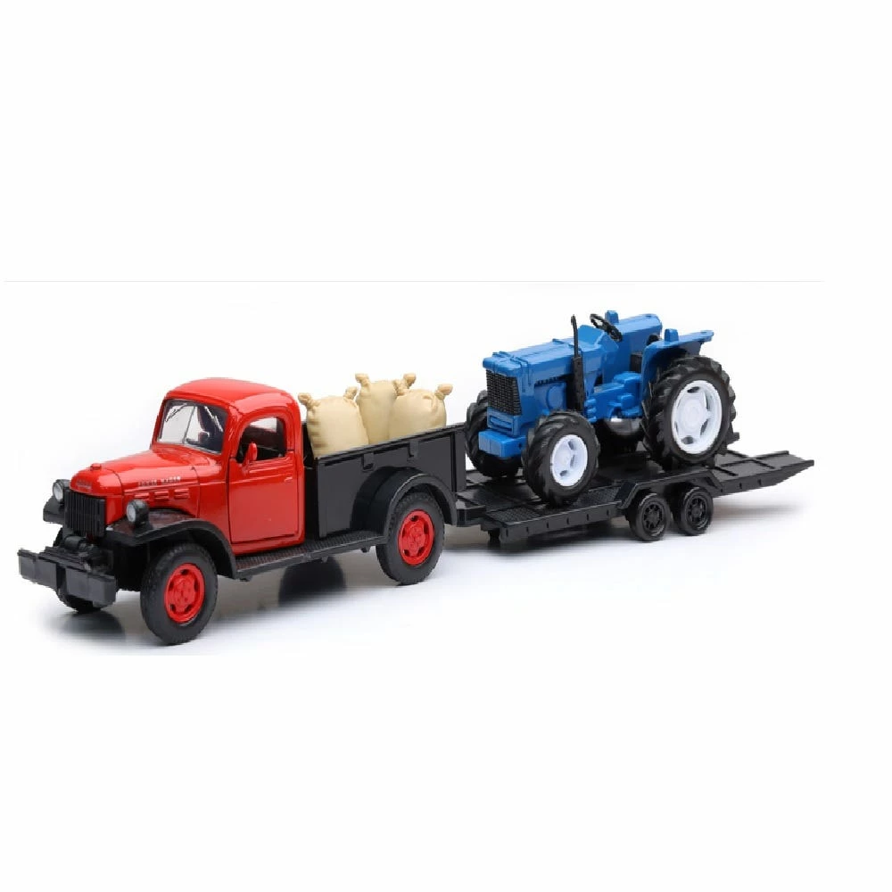1:32 scale licensed Chevrolet die cast vintage flatbed truck with vintage tractor; free-wheeling vehicles and round hay bales, for hauling, included