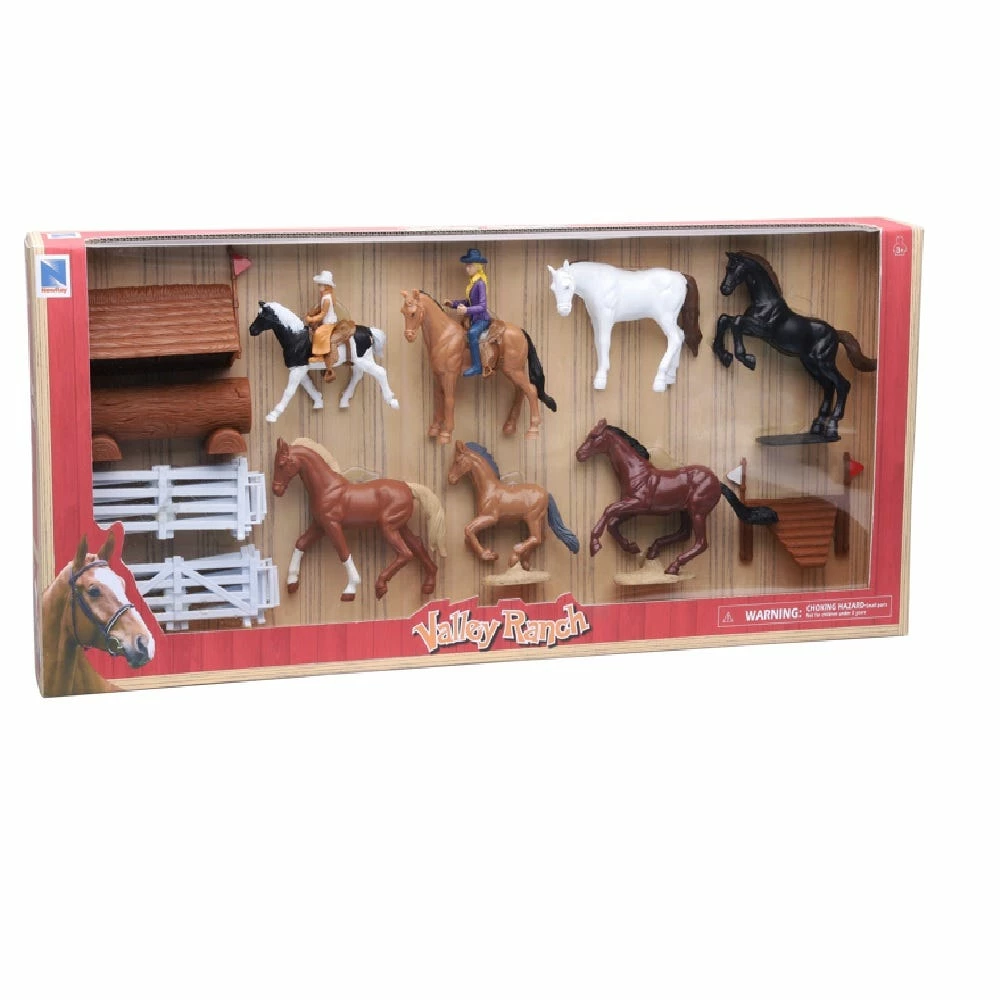 Valley Ranch horse accessory sets include seven action-formed horses, multiple figures and accessorized, themed to each set; choose from barrel racing or arena event themed