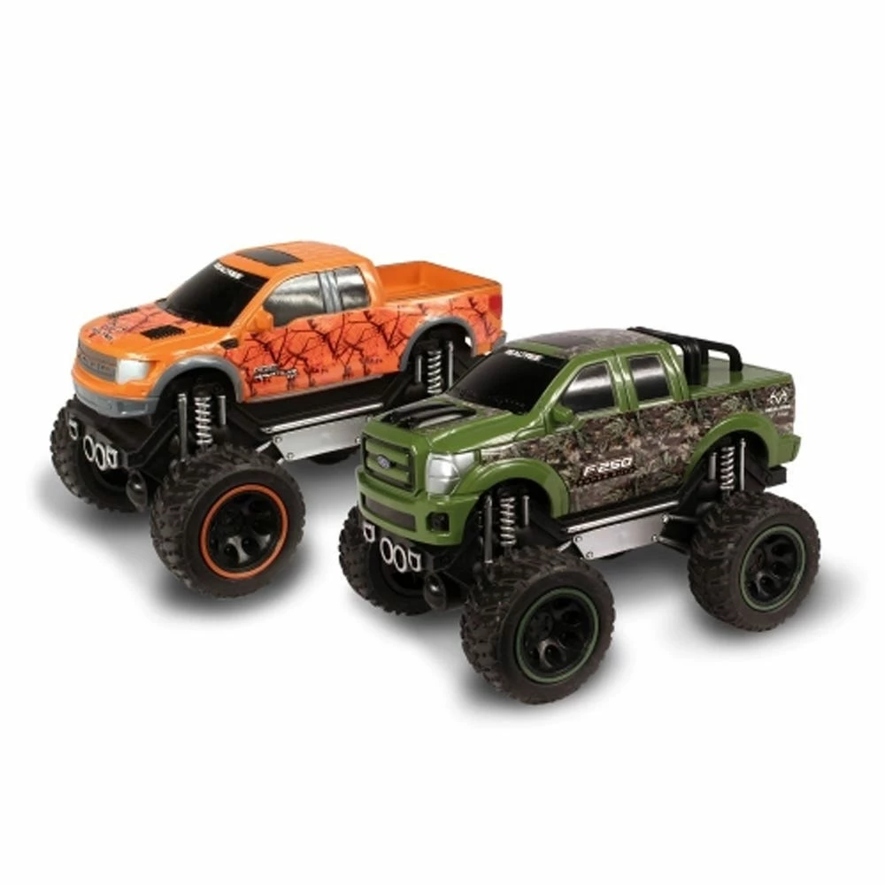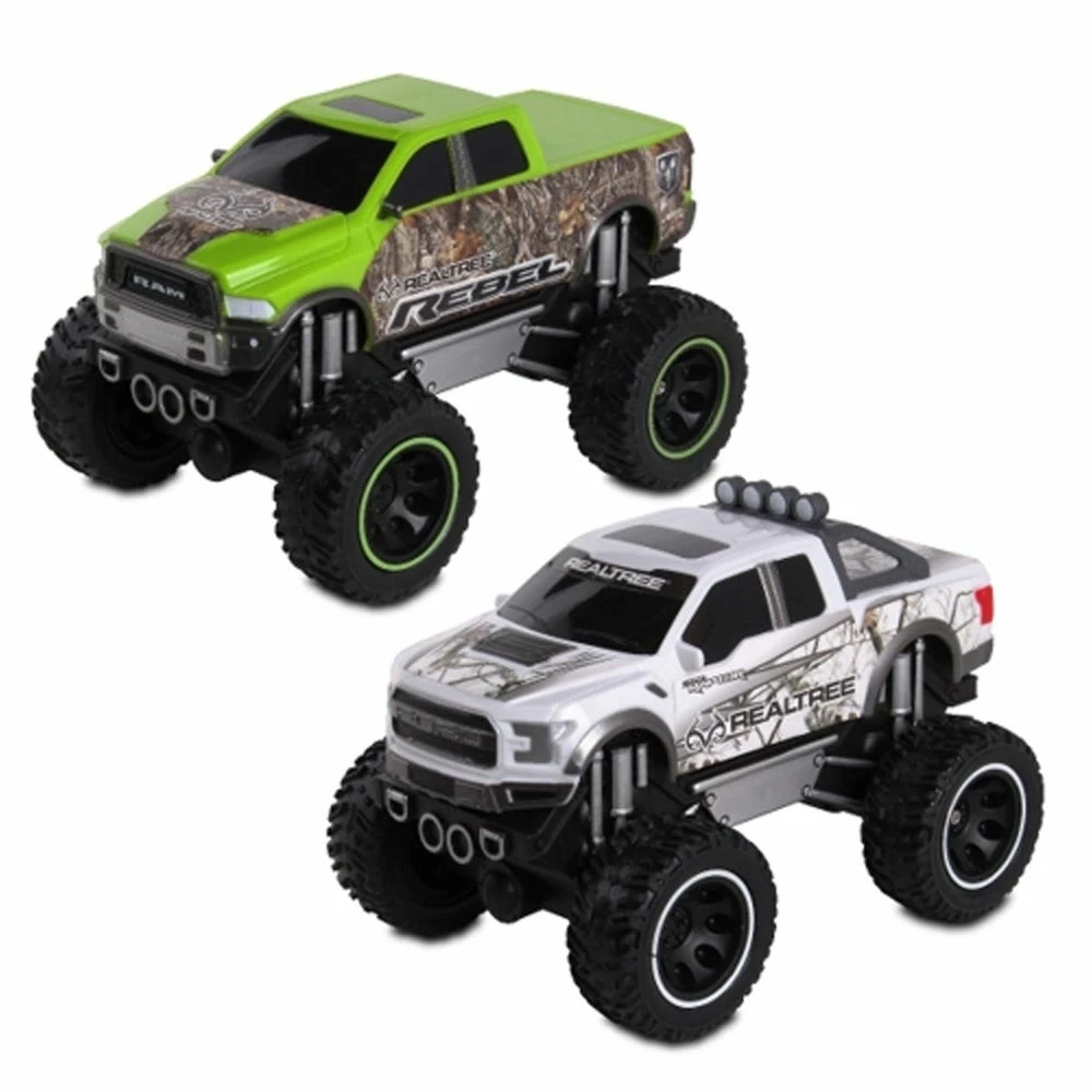 Three different RealTree sets of two off roading vehicles for hours of fun playtime. You can race them or share with a friend. Great for younger truck enthusiast as you can just push and go! The oversized off road tires make for a better grip and traction to get through rough terrain with ease.