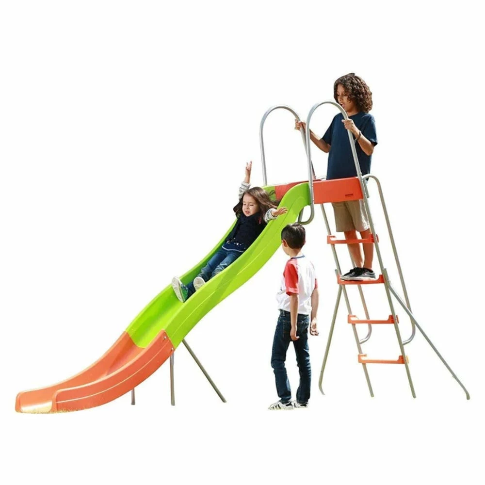 This premium quality toy consists of a sturdy steel frame, durable steps and chute made from a non-recycled plastic, coated with a UV-protected, fade-resistant, attractively colorful finish. Comes with a support bar for stabilization, deep chute sides, wide easy-to-climb steps, and smooth metal handrails that are designed to be perfectly safe for younger children. Our slide exceeds ASTM Safety Standards for maximum child safety; It will safely last you for years to come!