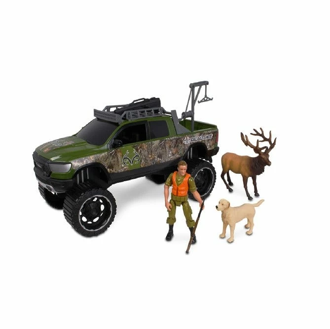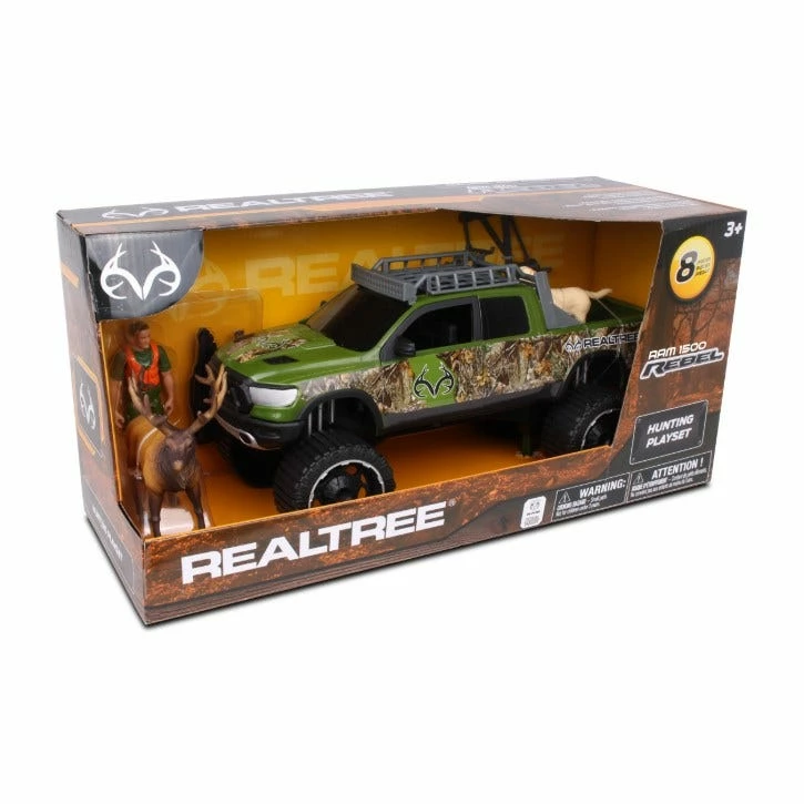 - 1:18 Scale playset features a detailed 4″ hunter figurine and RAM® 1500 Rebel, plus all the accessories for a hunting adventure!