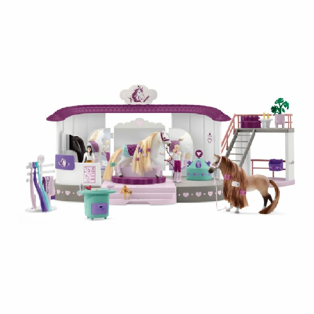 Our Horse Beauty Salon playset includes horse toys with groomable manes and tails and plenty of horse care accessories for hours of hands-on, screen-free fun.Has a stand-alone loft waiting area for the riders…perfect for socializing while the horses get a makeover! The clever design of the salon turntable includes underneath storage for hair beads, hair clips, and other horse beauty accessories. What are the horses getting fancied up for? Is there a horse show coming up? A parade? A cute new colt in the stable? The story is 100% yours! The Horse Beauty Salon playset is a great gift for girls and boys ages 4 and up who love horses! Add to the beauty-themed play experience by adding the Horse Pop-Up Boutique playset.