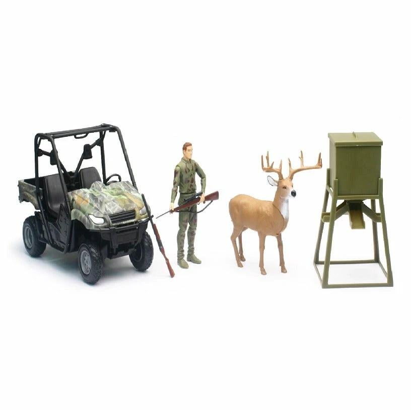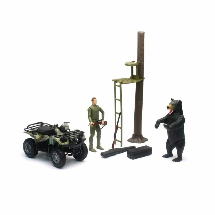 Available in two styles, bear hunting or deer hunting. the bear set includes a bear, tree stand, camo ATV and hunter figure. The seer set includes a buck deer, deer feeder, hunter and camo ATV.