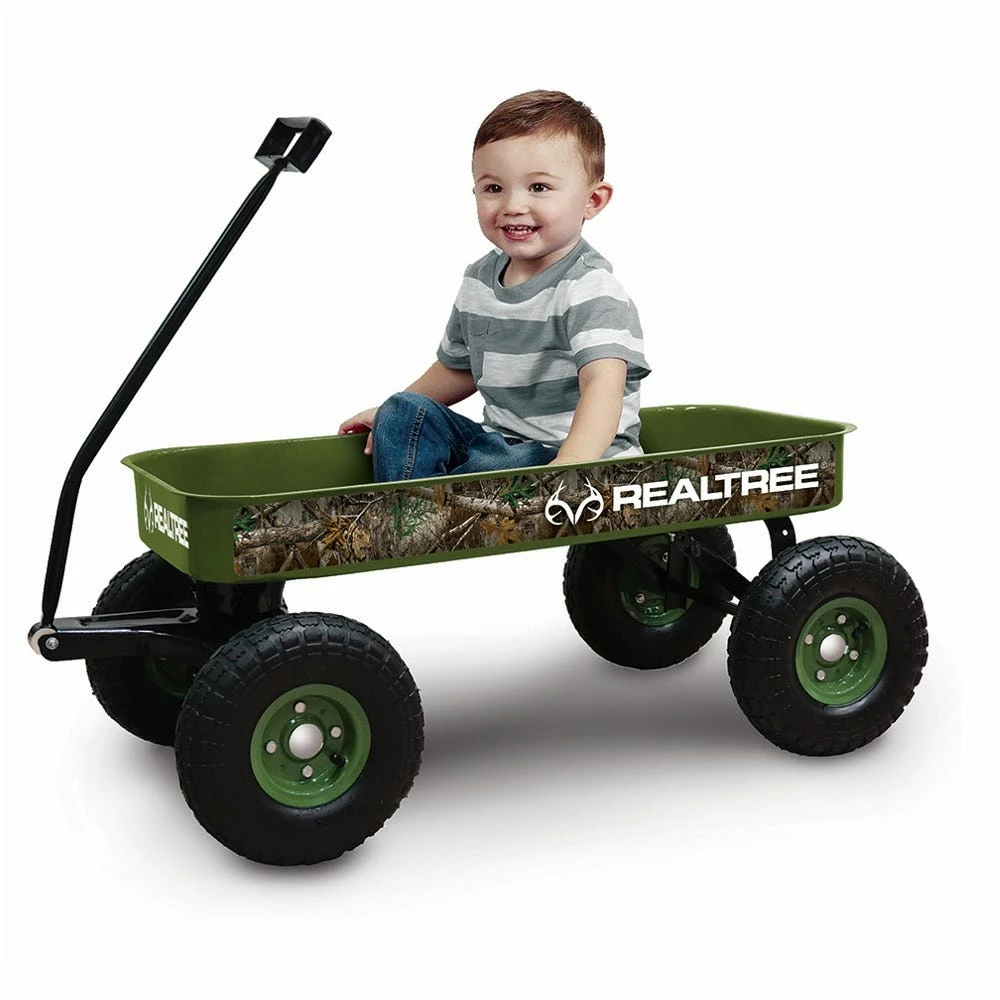 Get ready for the off-road adventures that bought by this Realtree Wagon! This Heavy-Gauge Stamped Steel Wagon is Officially Licensed by Realtree. Comes with rugged air tires which ensure a smooth ride and durability on all terrains. Perfect for children ages 2 and up, with a maximum weight limit of 200 pounds.