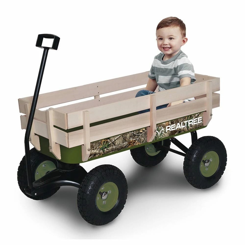 Get ready for the off-road adventures that bought by this Realtree Wagon! This Heavy-Gauge Stamped Steel Wagon is Officially Licensed by Realtree. Comes with rugged air tires which ensure a smooth ride and durability on all terrains. Perfect for children ages 2 and up, with a maximum weight limit of 200 pounds.