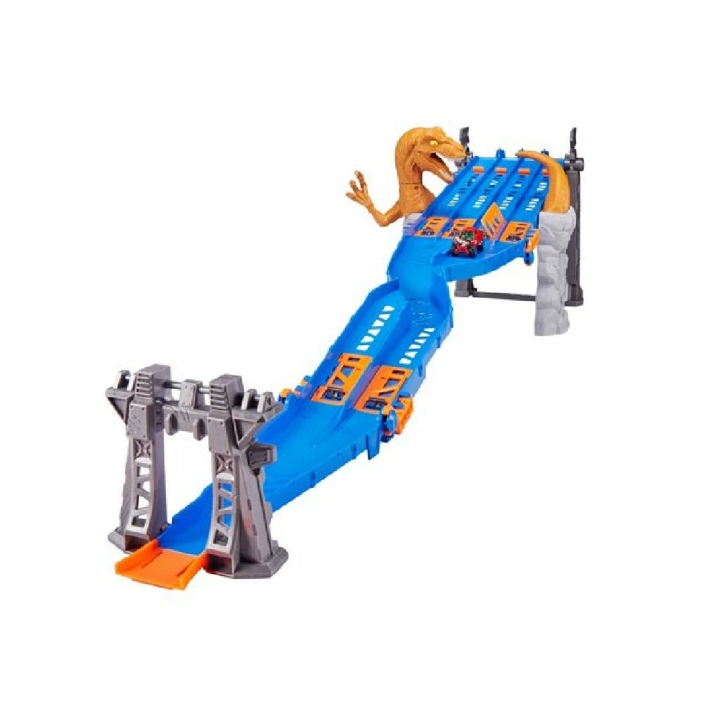 Unleash the Raider & your other Metal Machines into this action packed track set. This pack is absolute 4-lane madness. Beware of the attacking Raptor & the two hidden ejector traps along the track. Only one car can survive to finish the track!