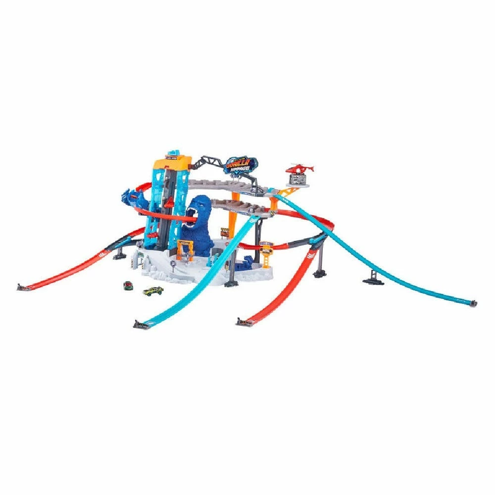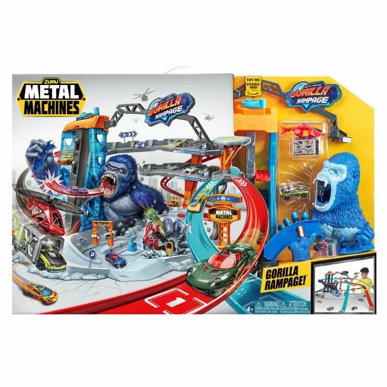 Unleash countless Metal Machines into this action-loaded playset that offers endless storytelling options and unlimited play fun! Speed through the massive Gorilla hand trap and the monstrous Gorilla mouth to overcome the beast! Most track and playset pieces are interchangeable and also track directions can be changed to allow infinite combination possibilities.